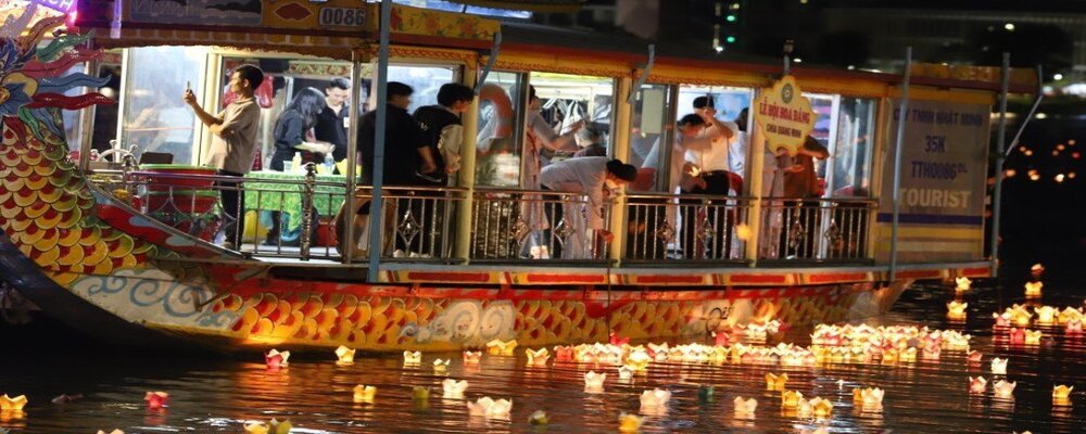 Khác hẳn hình ảnh ban ngày, hình ảnh sông Hương về đêm bỗng dưng trở nên thật thơ mộng và huyền ảo. Những ánh đèn lung linh chiếu xuống mặt nước làm nên một bức tranh đầy sắc màu. Khi đi thuyền rồng sông Hương, bạn sẽ cảm nhận về Huế một cách rõ rệt và cảm xúc hơn.