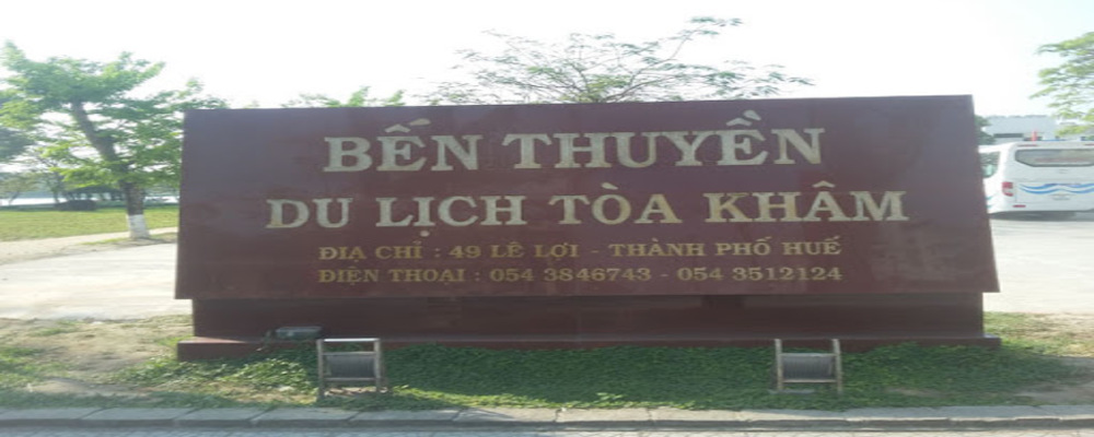 Bến thuyền Tòa tọa lạc 49 Lê Lợi, TP Huế. Giáp với khách sạn Hương Giang, nhà hàng nổi sông Hương và cầu Trường Tiền, nằm ngay ngã tư nối dài của đường Đội Cung và đường Lê Lợi.